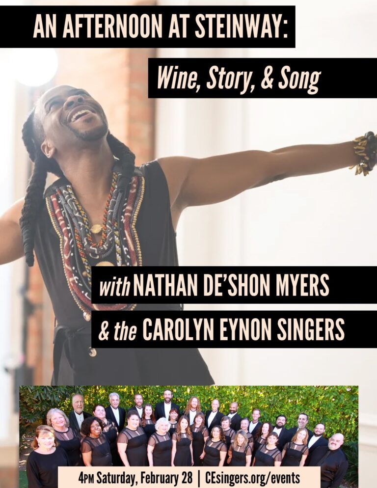 Renowned international baritone Nathan De’Shon Myers joins the Carolyn Eynon Singers for an intimate Black History Month celebration with wine, conversation, and song. An artist whose career bridges opera, jazz, gospel, Broadway, and choral music, Myers has collaborated with artists from Kirk Franklin to Kristin Chenoweth, contributed his voice to Grammy-winning recordings and film soundtracks including Hidden Figures, and performed with major opera houses in the U.S. and Europe. He currently serves as Associate Professor of Voice and Conductor of the Gospel Choir at ASU, where his work continues to shape the next generation of singers.